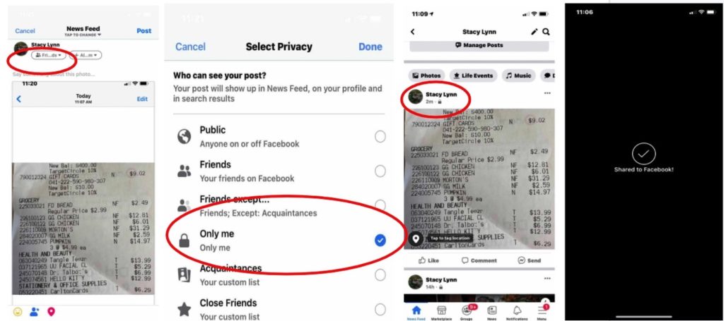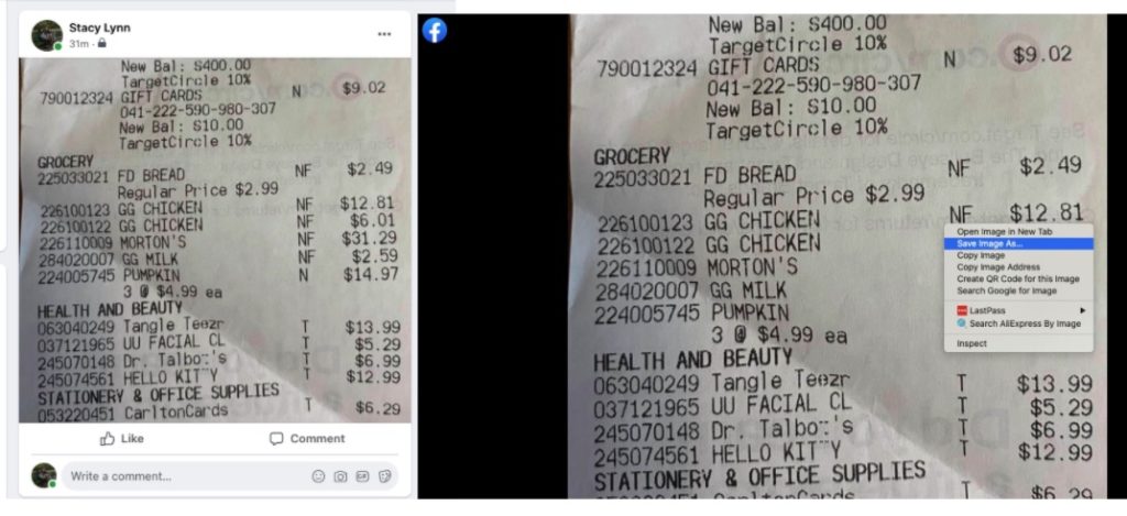 Using the camera on your phone, take a picture of the entire receipt. Make sure the image fits the full width of your screen. Include the store name, total price, and all products purchased with both the product name and description and price.