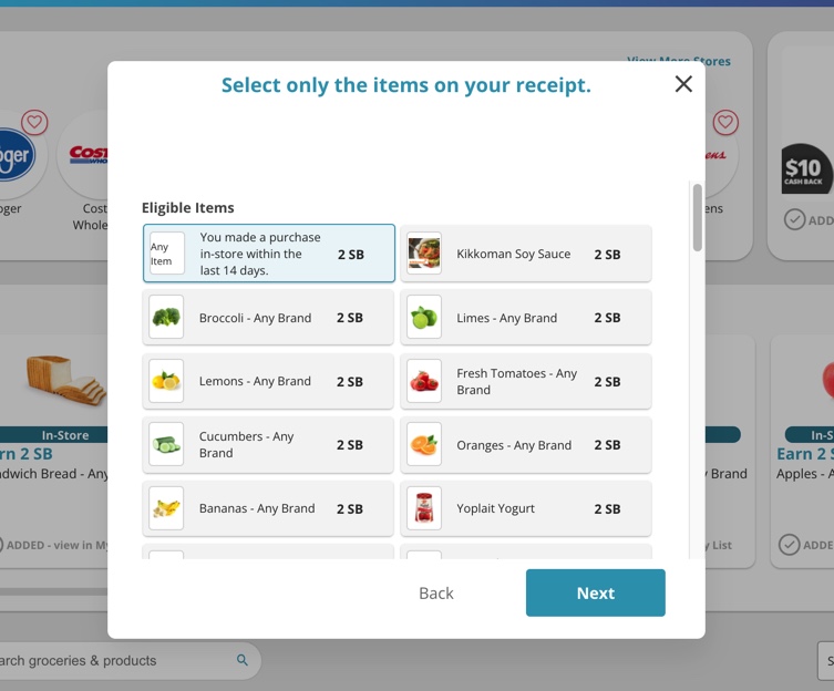 - Add your first grocery item. Just select an item to add to your grocery list. Just click or tap “+ Add to List” and you’ll earn 10 SB.
