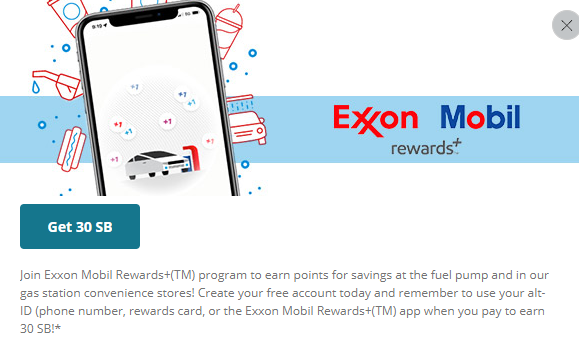 - Join Exxon Mobile Rewards+. Earn points for saving at the pump. Get the app and create a free account and get 30 SB. Get Exxon Mobile Rewards now.
