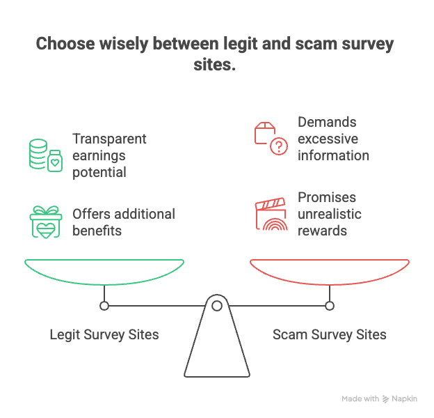 Legit survey sites are transparent with the earnings potential, have reviews from trusted sites, and usually offer additional benefits beyond just surveys.
