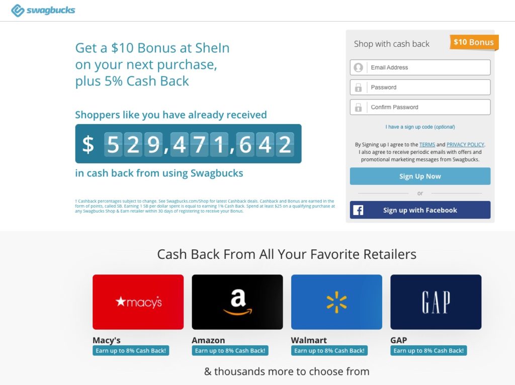 That’s it. Swagbucks will automatically record your shop visit and apply the cash back rebates to your account. You earn rewards in SB currency (100 SB = $1.00) and you can cash out with an Amazon gift card, Paypal deposit, or gift card to another popular retailer.
