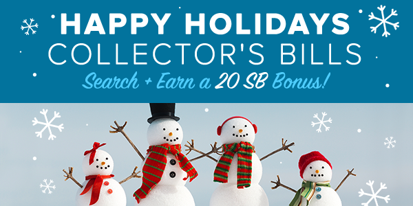 Collect all 5 Happy Holidays-themed Collector’s Bills and you’ll earn a 20 SB bonus!