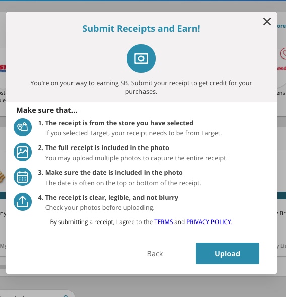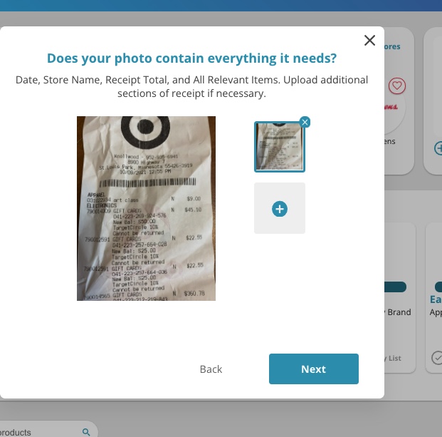 Next, upload your receipt. Make sure the photo of your receipt contains: the date, store name, receipt total, and all eligible items including item description and item purchase amount.