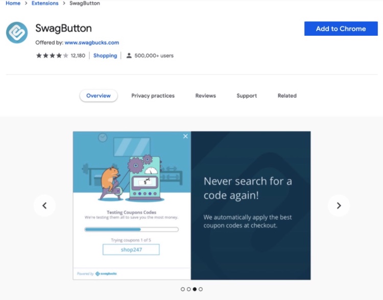 If you have the SwagButton installed, there’s no need to visit Swagbucks before visiting the merchant’s website. Just visit the merchant’s page and the SwagButton will alert you to the cash back and coupon deals available, and just tap or click to apply the savings.