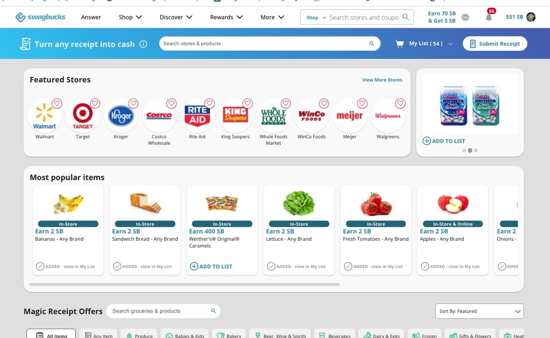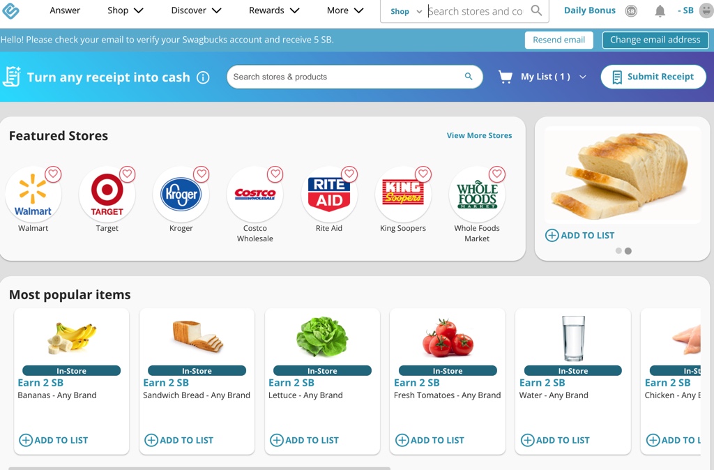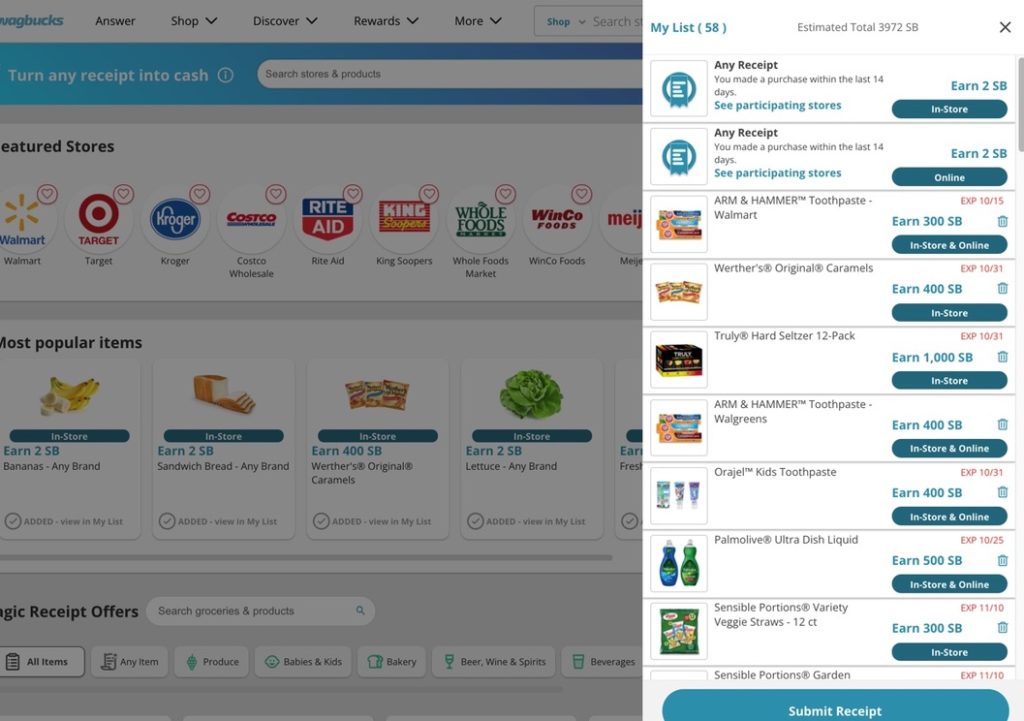 Visit “Magic Receipts” in the Swagbucks “Shop” tab, and you’ll see a number of different in-store offers. Purchase any of these featured supermarket items, and earn cash back.