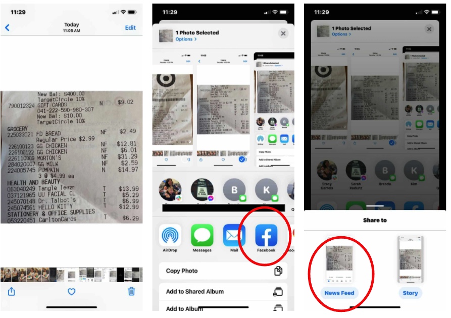 Using the camera on your phone, take a picture of the entire receipt. Make sure the image fits the full width of your screen. Include the store name, total price, and all products purchased with both the product name and description and price.