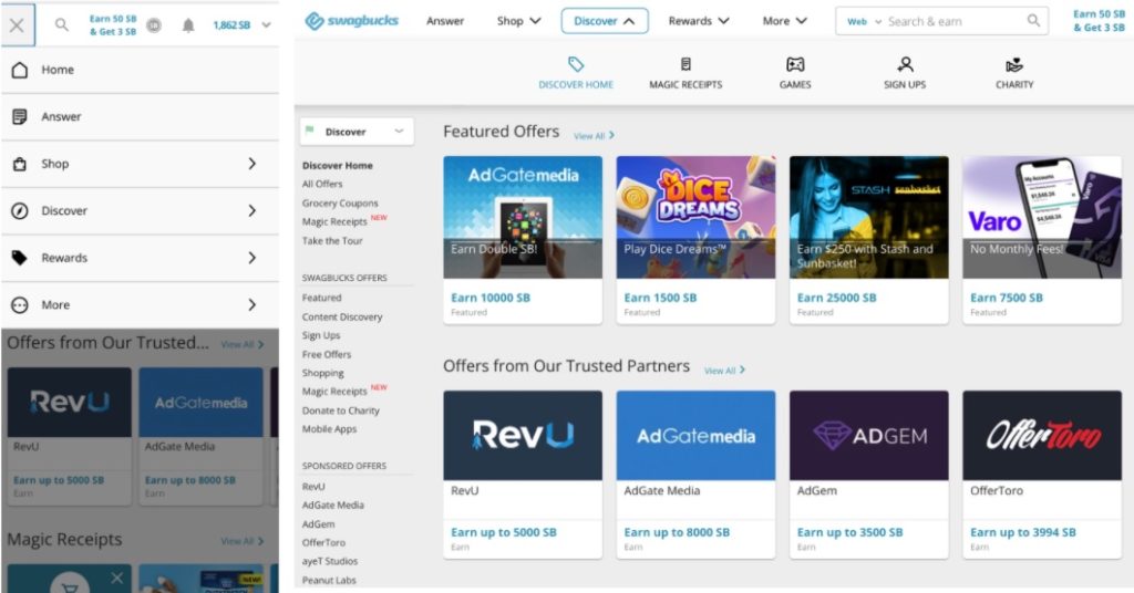 The Swagbucks “Discover” section is full of different offers (products and services) to discover.