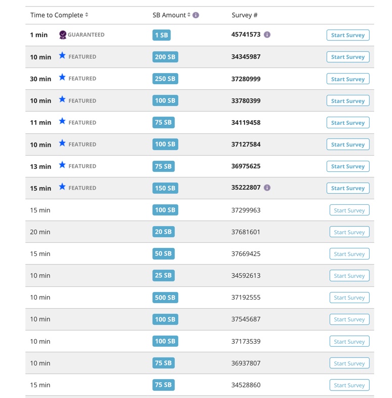 (Assumes at least 90 SB in earnings from attempting 5 surveys.)
