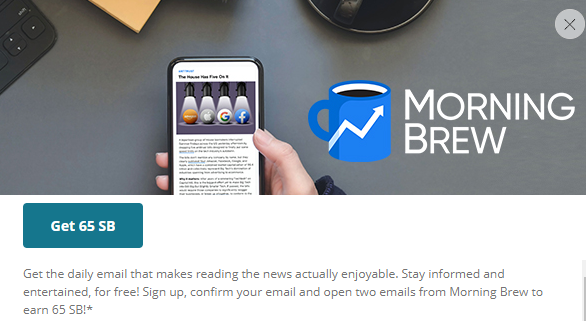 - Sign up for Morning Brew daily email. Sign up confirm your email and open the first 2 emails, get 65 SB. Get Morning Brew.