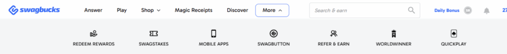 Some of you who are using Swagbucks via mobile web, may have already observed a slight change on our Games page. The familiar links to “WorldWinner” and “QuickPlay” may only be present for you when navigating on Desktop, however as of today, all members will be able to access WorldWinner and QuickPlay by clicking on the “More” tabs. Below you will find screenshots of the new and improved navigation.
