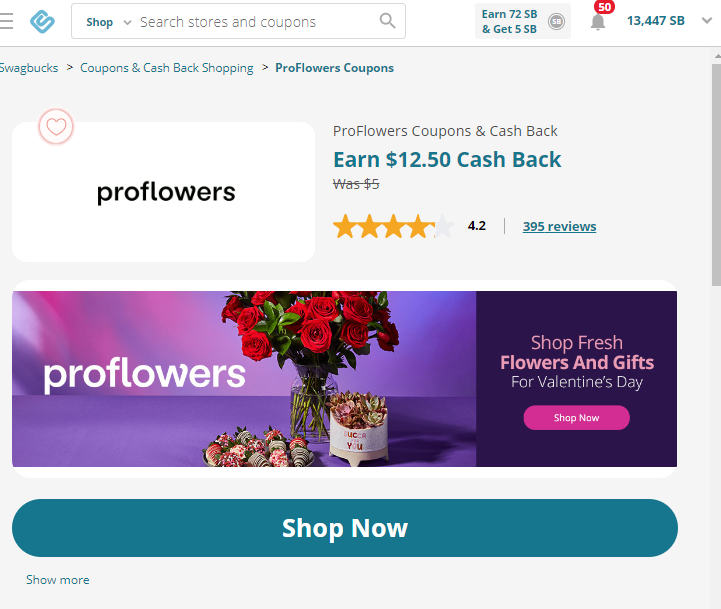 With these featured floral retailers, you can save money with promo codes and get free cash-back rebates. Get up to 1% to 10% cash back, or a set cash back bonus of $12.50. Just visit the retailer’s site through the link on Swagbucks.