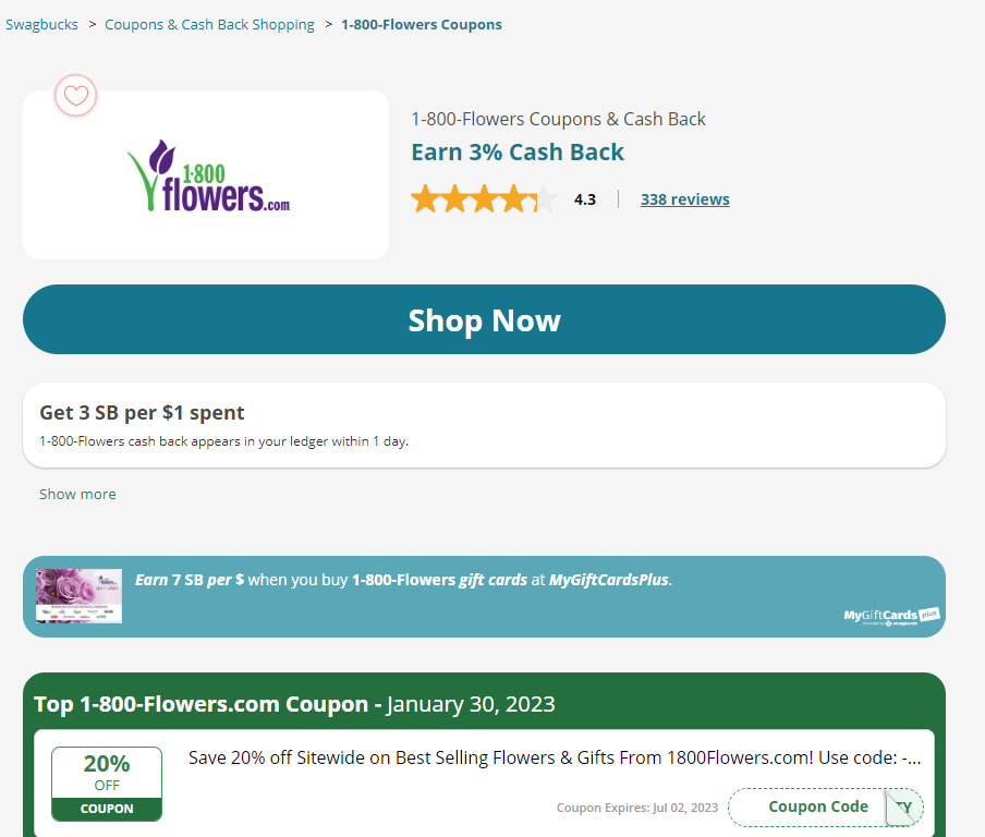 - 1-800-Flowers (+3% Cash Back)