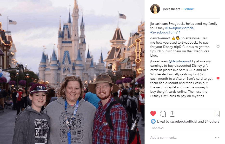 @JBreaShears wrote that she uses the rewards she earns at Swagbucks “to buy discounted Disney gift cards at places like Sam’s Club and BJ’s Wholesale. I usually cash my first $25 each month to a Visa or Sam’s card to get them at a discount and then I cash out the rest to PayPal and use the money to buy the gift cards online. Then use the Disney gift cards to pay on my trips.”