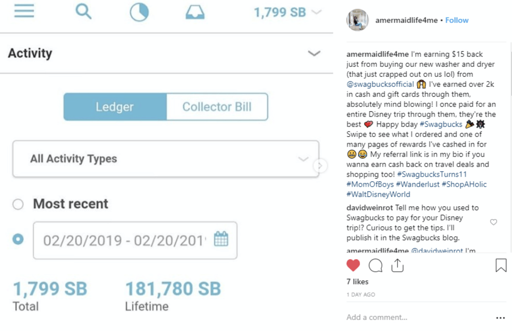 @AMermaidLife4Me shared on Instragam shared that she stays on top of her Daily Swagbucks Goal to ensure that she “gets a nice monthly bonus.” She adds that using Swagbucks’ cash back shopping service, answering Swagbucks’ paid online surveys and persistence are absolutely key. @AMermaidLife4Me is a fountainhead of info on all things related to Disney Vacations. Check her out.